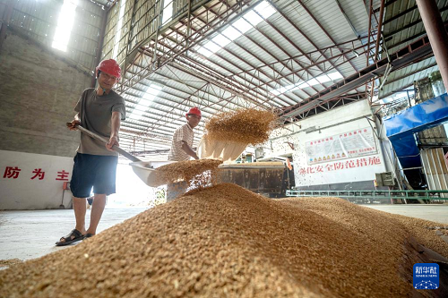 7月24日,在常德市鼎城區(qū)雙橋坪鎮(zhèn)一個水稻烘干工廠,工人把稻谷放入烘干設(shè)備。(新華社記者 陳思汗 攝)