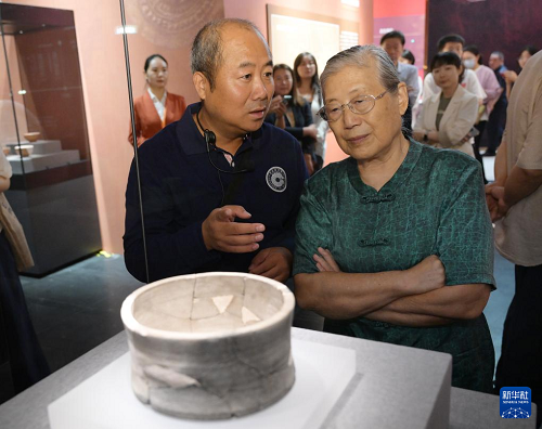 7月28日,著名考古學(xué)家、中國社會(huì)科學(xué)院考古研究所研究員安家瑤(右)在雄安新區(qū)聯(lián)合考古隊(duì)領(lǐng)隊(duì)何歲利的陪同下參觀展覽。(新華社記者 李賀 攝)