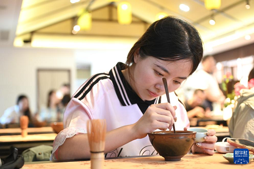 8月5日,在浙江省杭州市余杭區(qū)徑山村,一名游客體驗(yàn)傳統(tǒng)點(diǎn)茶。(新華社記者 毛竹 攝)