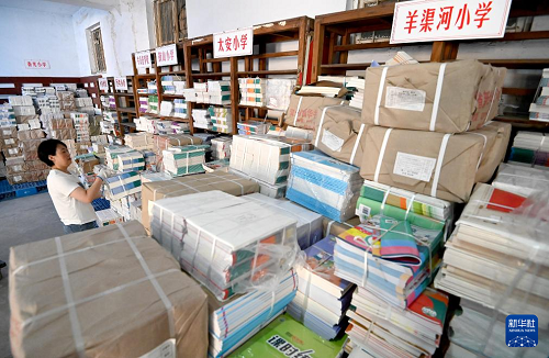 8月14日,河北省邯鄲市峰峰礦區(qū)新華書店的工作人員在倉庫清點新學(xué)期教材。(新華社發(fā) 郝群英 攝)