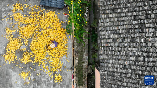 8月18日,猛董村村民在晾曬玉米(無人機(jī)照片)。(新華社發(fā) 胡程 攝)