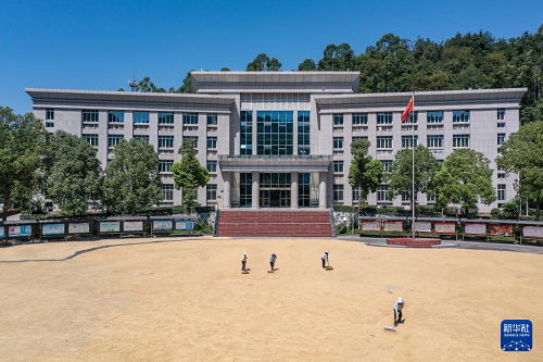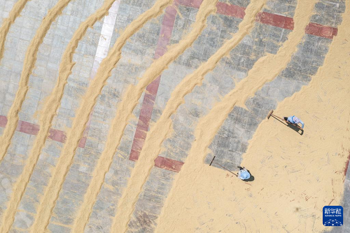 8月20日,人們在重慶市永川區(qū)紅爐鎮(zhèn)政府廣場上晾曬糧食(無人機照片)。(新華社記者 黃偉 攝)
