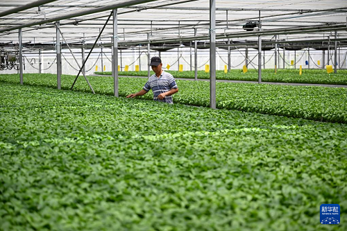 8月26日,工作人員在和縣綠緣溫室科技有限公司管護辣椒秧苗。(新華社記者 黃博涵 攝)