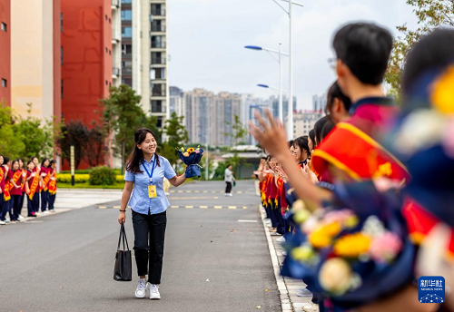 9月10日,學(xué)生在貴州省黔西第一中學(xué)列隊歡迎到校教師。(新華社發(fā) 范暉 攝)