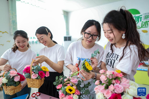 9月10日,在江蘇省泰州市姜堰區(qū)第四中學(xué),老師們參加教師節(jié)主題插花活動。(新華社發(fā) 周社根 攝)