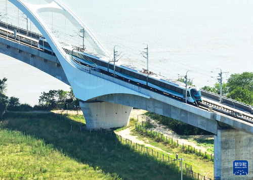 9月29日,列車通過福州濱??炀€烏龍江大橋(無人機照片)。(新華社記者 林善傳 攝)