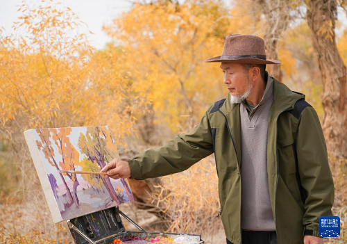 10月13日,繪畫(huà)愛(ài)好者在新疆巴音郭楞蒙古自治州尉犁縣一處胡楊林中寫(xiě)生。(新華社發(fā) 汪志鵬 攝)