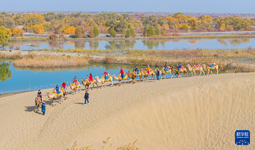 10月18日,游客在新疆巴音郭楞蒙古自治州尉犁縣羅布人村寨景區(qū)東沙山體驗(yàn)駱駝騎行(無(wú)人機(jī)照片)。(新華社發(fā) 汪志鵬 攝)