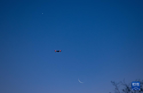 10月20日,在位于黑龍江省黑河市的北大荒集團北安分公司趙光農(nóng)場有限公司,攝影愛好者在用無人機拍攝啟明星伴月。(新華社發(fā) 錢泊羽 攝)
