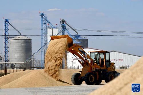 10月23日,鏟車在黑龍江北大荒農(nóng)業(yè)股份八五六分公司第六管理區(qū)一處曬場(chǎng)翻曬糧食。(新華社發(fā) 王金彬 攝)