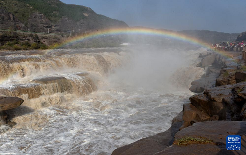 10月27日,位于山西吉縣和陜西宜川縣交界的黃河壺口瀑布景區(qū)天氣晴好,飛濺的水霧在陽(yáng)光照射下,形成一道壯美的“彩虹橋”。