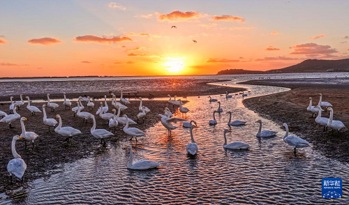 11月2日,在山東省榮成市成山鎮(zhèn)天鵝湖濕地,大天鵝在棲息、覓食(無人機(jī)照片)。(新華社發(fā) 李信君 攝)
