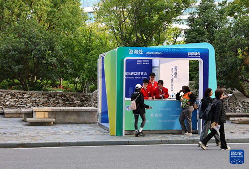 11月3日,志愿者在國(guó)家會(huì)展中心(上海)的一個(gè)咨詢處內(nèi)工作。(新華社記者 方喆 攝)