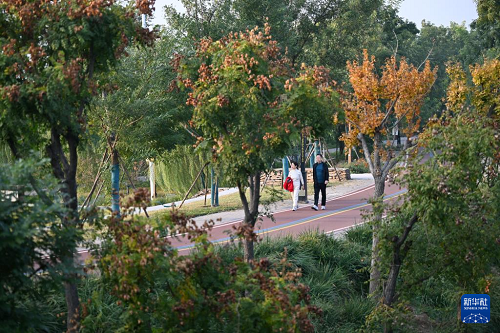 10月29日,市民在河北省滄州市運河區(qū)大運河堤頂路上散步。(新華社記者 牟宇 攝)