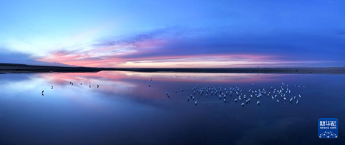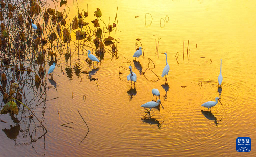 在甘肅省酒泉市阿克塞哈薩克族自治縣,白鷺在冬不拉水庫棲息覓食(無人機照片,11月9日攝)。(新華社發(fā) 高宏善 攝)