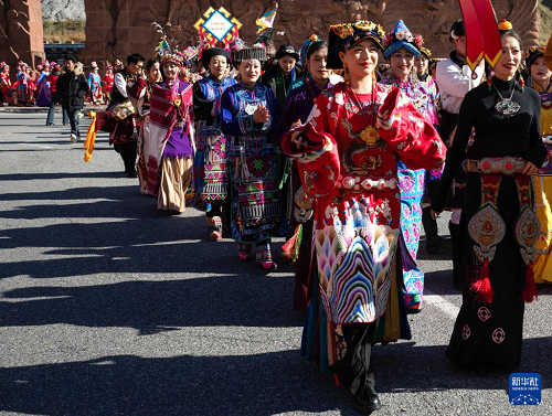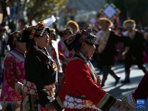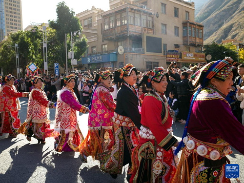 11月19日,在四川省汶川縣城,身著民族服飾的婦女參加非遺大巡游活動(dòng)。(新華社發(fā) 蘭紅光 攝)