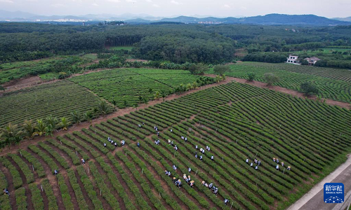 在海南省白沙黎族自治縣五里路茶園,學(xué)生在體驗(yàn)采茶(11月20日攝,無人機(jī)照片)。(新華社記者 楊冠宇 攝)