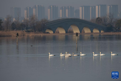 進入冬季,成群的候鳥飛抵安徽省滁州市明湖公園,在此休憩、覓食。明湖公園是一座融合自然景觀與人文景觀的城市公園,優(yōu)良的水質、豐茂的水草和豐富的魚蝦資源,使這里逐漸成為天鵝等越冬候鳥和各種鳥類的棲息地。