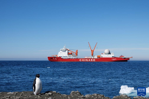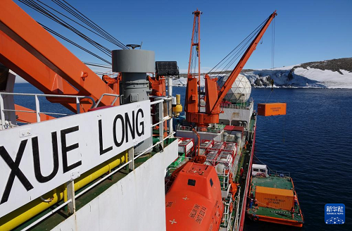 12月29日在秦嶺站海域拍攝的“雪龍”號(hào)極地科考破冰船。(新華社記者 顧天成 攝)