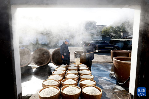 1月11日,在浙江省東陽市馬宅鎮(zhèn)屠梁村鐘山自然村,釀酒師傅在撈米。(新華社發(fā) 胡揚輝 攝)