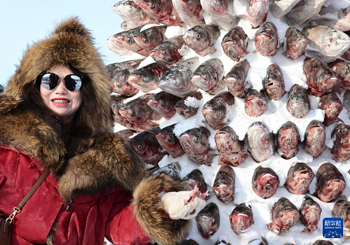1月10日,在黑龍江省肇東市大似海冬捕漁獵文化節(jié)上, 游客在“凍魚塔”前留影。(新華社發(fā) 楊威 攝)