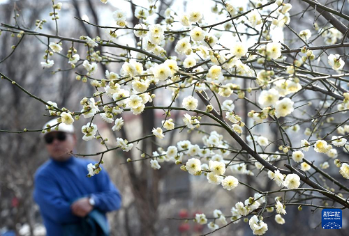 3月16日,一名游客在北京明長(zhǎng)城遺址公園欣賞綻放的梅花。(新華社記者 羅曉光 攝)