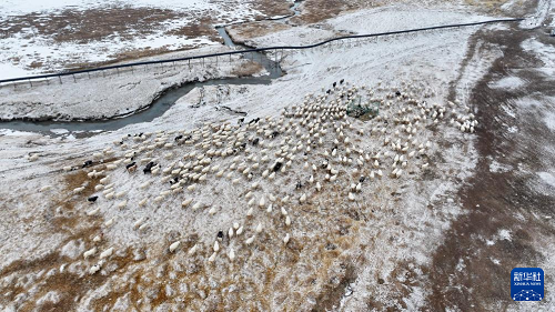 3月18日,在甘肅省阿克塞哈薩克族自治縣阿勒騰鄉(xiāng)哈爾騰村,羊群在哈爾騰河周邊覓食(無(wú)人機(jī)照片)。(新華社發(fā) 高宏善 攝)