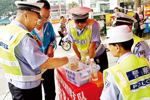 考試期間,市公安局交警支隊(duì)在各考點(diǎn)設(shè)置了便民服務(wù)點(diǎn),備好遮陽傘、雨傘、保溫水桶、礦泉水和考試專用的鋼筆、橡皮。便民服務(wù)臺(tái)還放置一個(gè)小藥箱,里面?zhèn)溆星鍥鲇?、防暑藥、藿香正氣水、感冒藥、腹瀉藥、速效救心丸、降壓藥等應(yīng)急藥品,以防考生及家長急用。