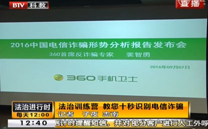 中國經(jīng)濟(jì)網(wǎng)北京9月12訊 生活中,當(dāng)你接到詐騙電話的時候,你要多久能發(fā)現(xiàn)這個騙局呢,10秒?20秒?還是根本識別不出來?9月10日,北京衛(wèi)視《法治進(jìn)行時》欄目在節(jié)目一開始便拋出了這樣一個問題。面對電信詐騙分子日益多變的手法,如何頭腦清晰地最快識別出騙局?這一期的《法治進(jìn)行時》和360手機(jī)衛(wèi)士專家一起給大家提供了很多實用的建議。