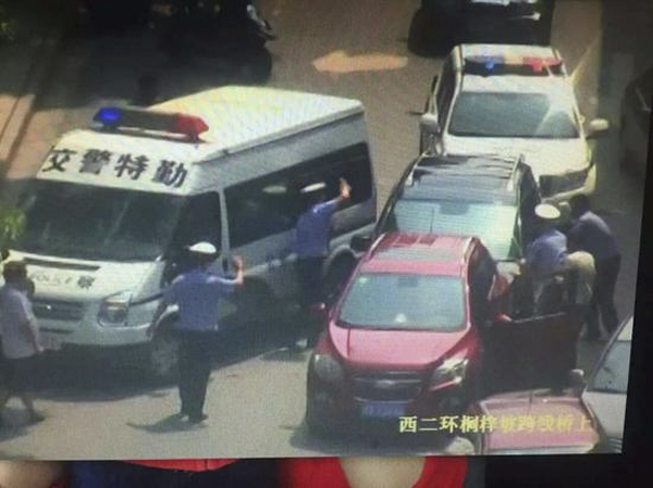 長沙交警特勤大隊(duì)民警在桐梓坡路西二環(huán)橋下開展例行酒駕整治時(shí),車牌為湘A27K07的黑色小型越野車駕駛?cè)司懿幌ɑ?,并緊閉車門、車窗,拒絕出示相關(guān)證件和下車配合接受酒精測(cè)試。 圖片來源于新浪微博