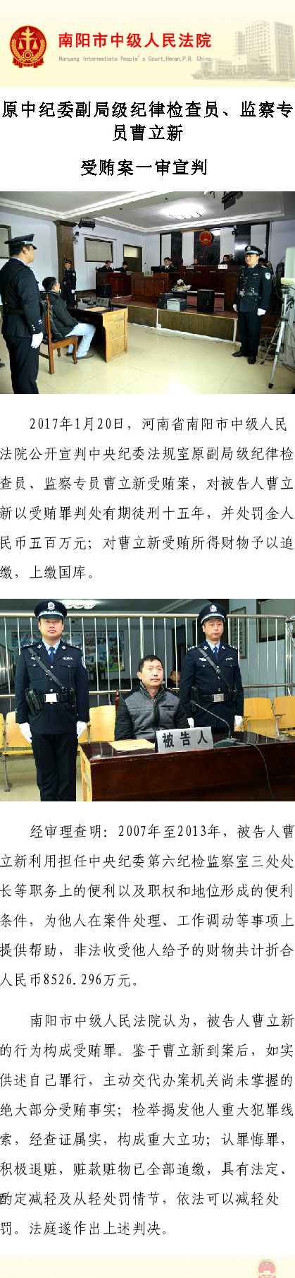 據(jù)南陽(yáng)市中級(jí)人民法院官方微博消息,2017年1月20日,河南省南陽(yáng)市中級(jí)人民法院公開(kāi)宣判中央紀(jì)委法規(guī)室原副局級(jí)紀(jì)律檢查員、監(jiān)察專(zhuān)員曹立新受賄案,對(duì)被告人曹立新以受賄罪判處有期徒刑十五年,并處罰金人民幣五百萬(wàn)元;對(duì)曹立新受賄所得財(cái)物予以追繳,上繳國(guó)庫(kù)。