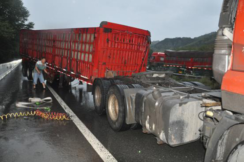 2017年08月26日19時00分許,高速二支隊九大隊民警翟躍、郭騏源接到報警稱:在五保高速8km處,有一輛紅色東風牌重型半掛貨車因出車前未檢查車輛,駕駛存在安全隱患的車輛上路行駛,將掛車脫落,后與中央護欄發(fā)生碰撞,造成車輛及路產不同程度損壞的道路交通事故。大隊民警第一時間趕赴現場,只有超車道可以通行,在做好安全防護的情況下,及時詢問當事人是否受傷,是否需要撥打“120”急救,并了解了當時的事發(fā)情況。當事人稱:“自己一個人開車去陜西拉煤,走的時候著急,沒檢查車輛,在行駛過程中,就感覺車輛掛車在擺動,因為是雨天,也沒在意,行駛到8km處時,踩剎車過急,加之路面濕滑,掛車突然脫落與中央護欄發(fā)生碰撞,所幸人沒有受傷?!敝螅窬瘜ΜF場進行勘查,并調取監(jiān)控視頻,發(fā)現車輛在剎車時,車速較快,駕駛員駕駛存在安全隱患的車輛是造成事故發(fā)生的原因。