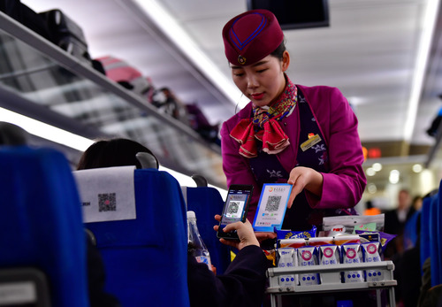 圖為在重慶客運(yùn)段G8516次列車上,一名旅客在使用手機(jī)掃碼支付購(gòu)買(mǎi)飲用水。新華社記者 劉潺 攝