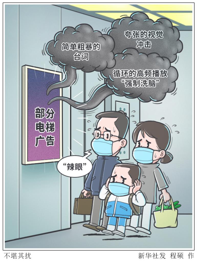 身著“清涼”的女模特大喊“沒有XXX,我不脫!”;女子掀開“暴汗服”露出腹部,“潑”出大量汗水;身材壯碩的男模特躺在餐桌上,名為“小鮮肉上桌”……記者近日發(fā)現,在眾多住宅樓電梯間,雷人雷語的“辣眼”廣告層出不窮。這些廣告以簡單粗暴的臺詞、夸張的視覺沖擊、循環(huán)的高頻播放“強制洗腦”,引起大量居民不適與反感。