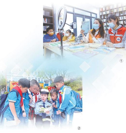 圖①:江蘇省如皋市如城街道聯(lián)合愛行動實踐中心,走進(jìn)當(dāng)?shù)仡櫱f社區(qū)農(nóng)家書屋,通過“線上+線下”方式開展“愛閱護(hù)苗”主題公益課堂活動。圖為志愿者通過網(wǎng)絡(luò)平臺為學(xué)生推薦好書。