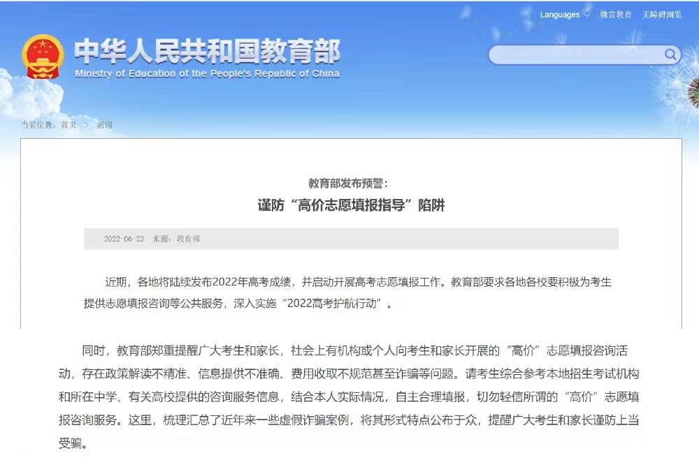 近日,教育部發(fā)布預警,提醒考生謹防“高價志愿填報指導”陷阱。有網(wǎng)站虛假宣傳擁有所謂“內部信息”,自稱掌握內部大數(shù)據(jù),能夠“精準定位院?!钡鹊?。事實上,每年高考填報志愿前,各省級招生考試機構都會發(fā)布當年高考成績統(tǒng)計情況和近年來各高校錄取分數(shù)情況,并不存在市面上的咨詢機構或個人聲稱的“內部信息”。還有一些咨詢機構假冒所謂志愿填報專家身份。該咨詢機構打出廣告,稱團隊的專家“獲得高考志愿規(guī)劃師認證”“來自著名高校”等。事實上,有關部門從未發(fā)放過“高考志愿規(guī)劃師”這類職業(yè)資格證書。該機構一些所謂“志愿規(guī)劃師”都是臨時招募的社會人員,按照總部提供的“臺詞”給考生和家長輔導。家長購買這些機構的服務不僅花了冤枉錢,而且可能報錯志愿。
