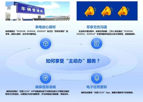 “主動辦”提醒服務(wù)的推出,是忻州市公安局交警支隊深入貫徹以人民為中心的發(fā)展思想,切實解決群眾辦事難、辦事慢、多頭跑、來回跑等問題的有力舉措。通過這一服務(wù),群眾將真正實現(xiàn)“群眾零跑腿、服務(wù)零距離”,享受到更加便捷、高效的車管服務(wù)。