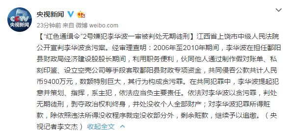 人民網(wǎng)北京1月23日電 據(jù)中央電視臺(tái)新聞中心官方微博消息,江西省上饒市中級(jí)人民法院公開宣判李華波貪污案。