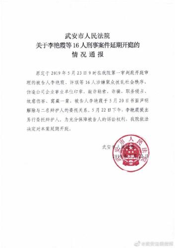 通報(bào)還稱,原定于2019年5月23日9時(shí)在武安市人民法院第一審判庭開(kāi)庭審理的被告人李艷霞、許琪等16人涉嫌聚眾擾亂社會(huì)秩序偽造公司企業(yè)事業(yè)單位印章、敲詐勒索、詐騙、職務(wù)侵占、故意傷害、窩藏一案,被告人李艷霞于5月20日書(shū)面聲明解除與二名辯護(hù)人的委托關(guān)系。5月 22日下午,李艷霞提出另行委托辯護(hù)人。為充分保障被告人的訴訟權(quán)利,武安市人民法院依法決定對(duì)本案延期開(kāi)庭。