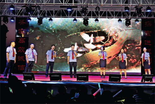 這場以“頌歌獻(xiàn)給黨,共圓中國夢”為主題的文藝晚會,是保安押運人精心組織,自編、自導(dǎo)、自演的一臺節(jié)目,就像該公司黨委書記陳志平所說:“這場文藝晚會是我們保安押運人向黨95歲華誕獻(xiàn)上的頌歌?!?月29日第一場晚會于晚8時正式上演,晚上7時便有觀眾陸續(xù)來到演出現(xiàn)場。第一場晚會就讓觀眾大呼過癮,節(jié)目形式多樣,有小合唱、獨唱、配樂詩朗誦、舞蹈、雙簧、小品、服裝秀等。其中舞蹈《映山紅》、男生獨唱《紅旗飄飄》、電聲樂隊《閃閃的紅星》歌曲串燒等用不同的藝術(shù)形式表現(xiàn)了保安押運人對黨和祖國的熱愛之情,感染了現(xiàn)場的觀眾;而雙簧表演《文武雙全》將晚會現(xiàn)場氣氛推向高潮,兩位表演者夸張的表情、搞笑的扮相引得觀眾連連叫好。