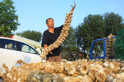 7月30日,原平市陽(yáng)房村蒜農(nóng)正在農(nóng)產(chǎn)品市場(chǎng)銷(xiāo)售紫皮蒜。原平紫皮蒜是當(dāng)?shù)氐钠放妻r(nóng)產(chǎn)品,盛產(chǎn)于滹沱河沿岸的新原鄉(xiāng)和西鎮(zhèn)鄉(xiāng),不僅是調(diào)味佳品,而且食用具有藥用價(jià)值,省內(nèi)外客商慕名而來(lái)購(gòu)買(mǎi),深受歡迎。(吉建平 攝)