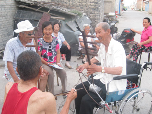 7月31日,河曲縣北元村一處街頭巷口傳出陣陣音樂和“山曲兒”聲。愛好文藝的氣象局退休人員段王鎖和村民經(jīng)常相聚街頭巷口,吹的吹,拉的拉,唱的唱,每每吸引鄉(xiāng)親們前來共享“農(nóng)家樂”。既起到了陶情怡性的作用,也給鄉(xiāng)親們帶來具有鄉(xiāng)土風味的精神食糧。(賈金理 攝)