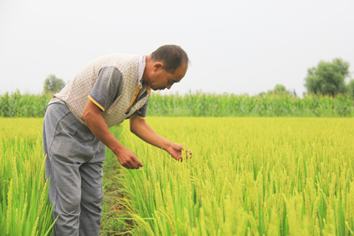 8月13日,原平市大庫狄村民王財旺正在稻田里查看長勢。山西省原平市大庫狄村依傍滹沱河不缺水的優(yōu)勢,發(fā)展水稻特色種植,生產(chǎn)的優(yōu)質(zhì)大米成為品牌,商家客戶上門收購,富了村民。預(yù)計今年畝產(chǎn)可達到千斤。(吉建平 攝)