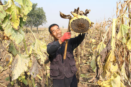10月13日,原平市解村鄉(xiāng)圪坨村林同種植專業(yè)合作社正在收獲向日葵,該社引進三瑞公司種植1000余畝SH363向日葵喜獲豐收。近年來,該市積極引導農(nóng)民調(diào)整農(nóng)業(yè)產(chǎn)業(yè)結(jié)構(gòu),采取“合作社+農(nóng)戶”的模式,向日葵比玉米收入高四倍,銷售價每斤4塊左右,合作社為農(nóng)戶提供種子、種植技術(shù)等服務(wù),帶動當?shù)厝罕娫鍪罩赂弧?span style="font-family: 楷體,楷體_gb2312, simkai">圖為解村鄉(xiāng)村民趁著秋高氣爽的晴好天氣,在田間地頭葵花籽的情景。(褚震 攝)