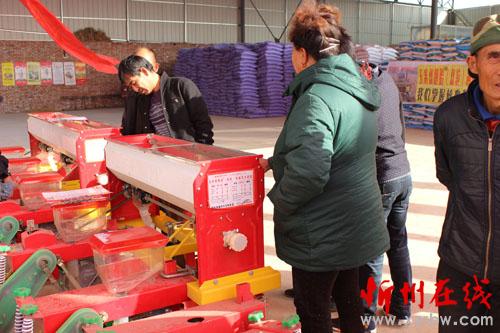 11月17日,來自原平市西鎮(zhèn)鄉(xiāng)的幾位農(nóng)民在聚農(nóng)豐測土配肥中心選擇新型“雙胞胎”播種機,該機采用一穴雙株,寬窄行種植,畝留苗可比傳統(tǒng)播種機每畝增加上千株,增產(chǎn)20%以上,成為今后農(nóng)民的首選播種機。(曹申義 攝)