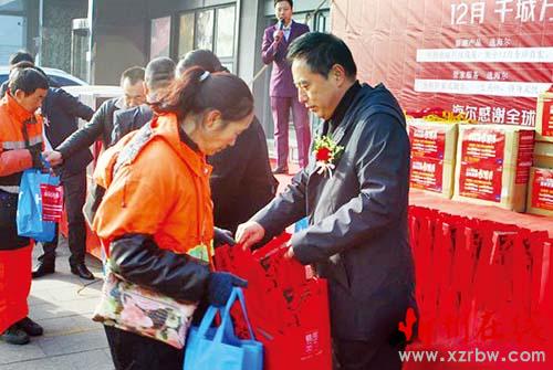 本報(bào)訊12月9日,我市環(huán)衛(wèi)工人領(lǐng)到海爾專(zhuān)賣(mài)店贈(zèng)送的冬季防寒用品。隨著較強(qiáng)冷空氣帶來(lái)的降溫,忻州城區(qū)氣溫急轉(zhuǎn)直下。當(dāng)天上午,忻州海爾專(zhuān)賣(mài)店為現(xiàn)場(chǎng)50余名環(huán)衛(wèi)工人代表發(fā)放了“ 防寒禮包”,給冬日里工作在一線(xiàn)的“馬路天使”們送來(lái)了一份溫暖。同時(shí),還將一個(gè)大蛋糕分送給環(huán)衛(wèi)工人,為他們送上了特別的關(guān)懷。