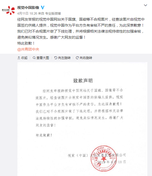 4月11日,視覺(jué)中國(guó)因黑洞照片版權(quán)問(wèn)題引發(fā)公眾質(zhì)疑,共青團(tuán)中央官方微博更是直接質(zhì)問(wèn)“國(guó)旗、國(guó)徽版權(quán)也是貴公司的?”直指其版權(quán)不合理售賣(mài)問(wèn)題。視覺(jué)中國(guó)官方微博當(dāng)日回應(yīng),經(jīng)網(wǎng)友舉報(bào)的視覺(jué)中國(guó)網(wǎng)站關(guān)于國(guó)旗、國(guó)徽等不合規(guī)圖片,經(jīng)查該圖片由視覺(jué)中國(guó)簽約供稿人提供,視覺(jué)中國(guó)作為平臺(tái)方負(fù)有審核不嚴(yán)的責(zé)任,為此深表歉意!已對(duì)不合規(guī)圖片做了下線處理,并將根據(jù)相關(guān)法律法規(guī)持續(xù)性的加強(qiáng)審核,避免類(lèi)似情況發(fā)生。