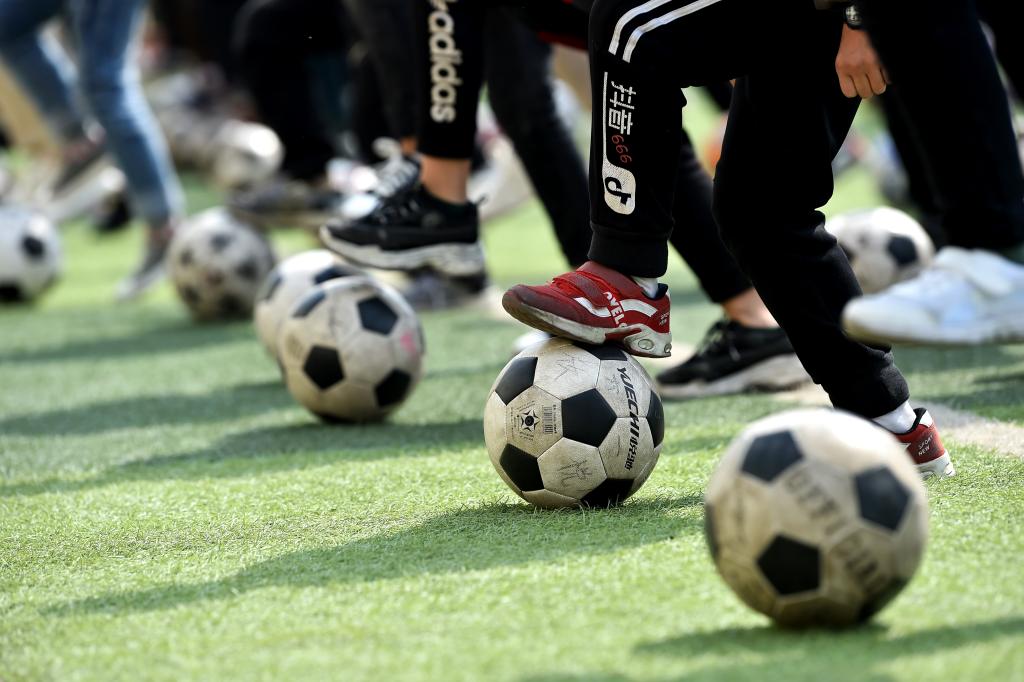 ↑這是學(xué)生們在球場上進(jìn)行足球訓(xùn)練(4月18日攝)。新華社記者詹彥攝