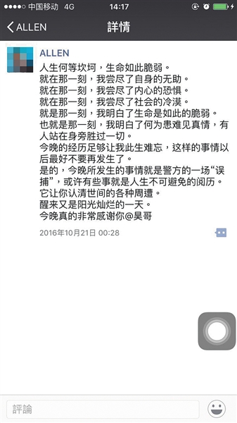 事后,被錯抓的大學生黃誠發(fā)朋友圈感慨“嘗盡恐懼”。