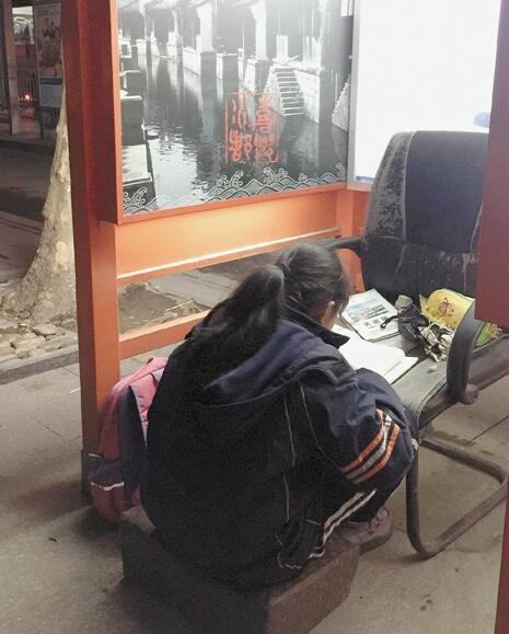 照片上這個四面漏風的電話亭,是嘉興12歲女孩曉華的“書房”,一把舊椅子當書桌,沙發(fā)坐墊當?shù)首?,每天借著昏暗的照明燈看書做作業(yè)。